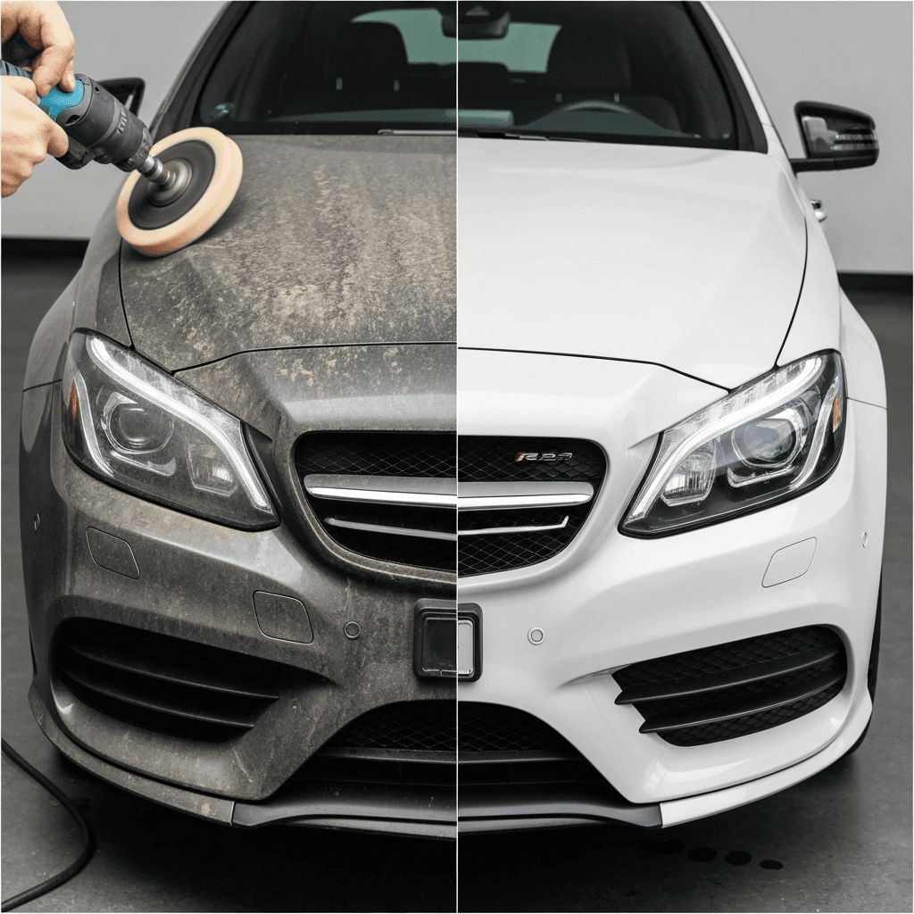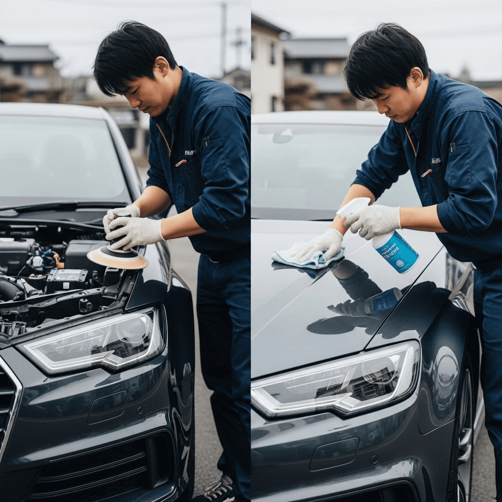 RS3セダンはヘッドライトの黄ばみとボディの鉄粉が第一印象を損ねます。研磨+鉄粉除去クリーナー+ワックスで輝きを取り戻せば「程度良好」と判断され+4~7万円の効果。