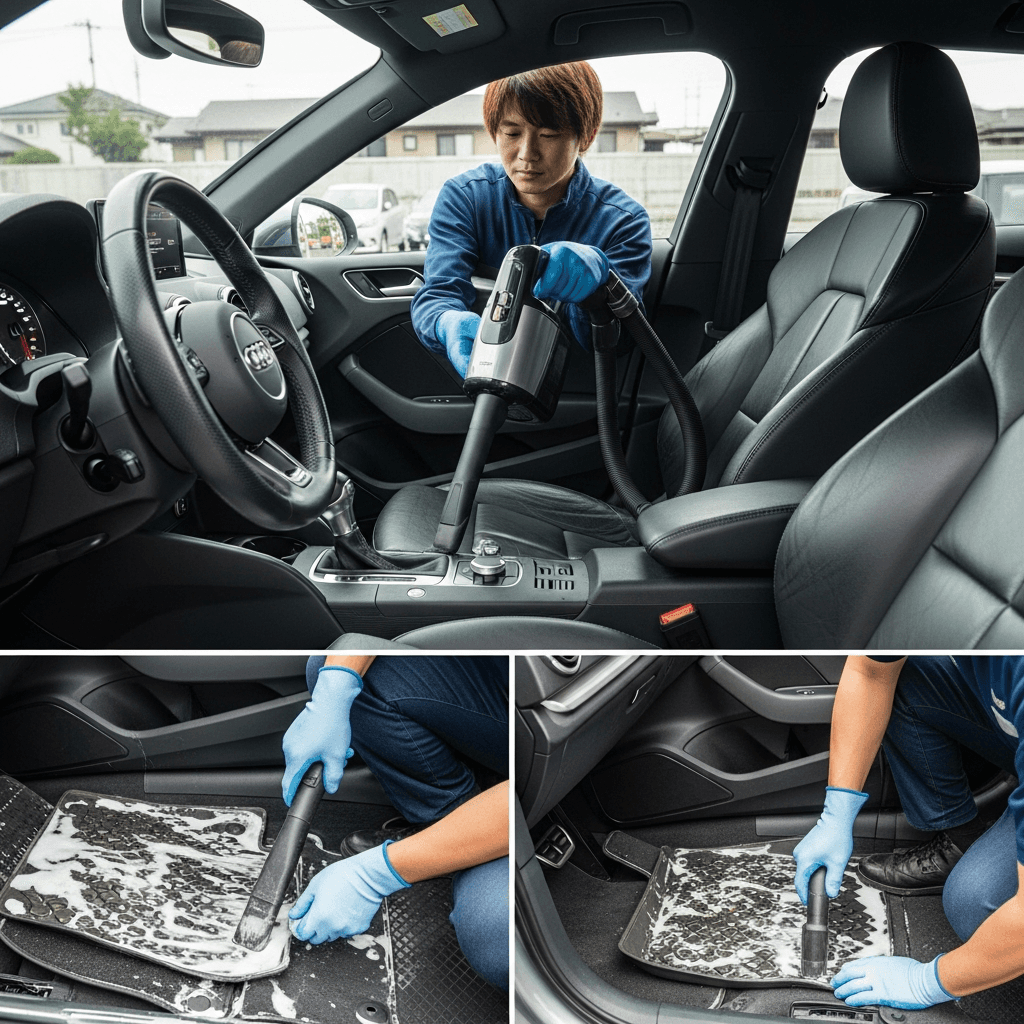 RS3セダンは第一印象が査定の8割を決めます。シート隙間のゴミ除去、マット洗浄、樹脂パーツ艶出しで新車級の清潔感に。特に臭いゼロなら「禁煙車」扱いで+5~8万円UP。
