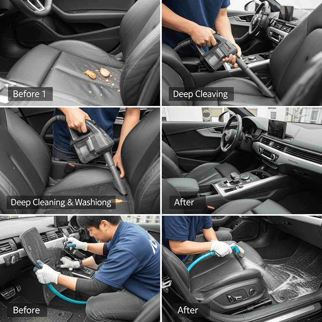 RS4アバントは第一印象が査定の8割を決めます。シート隙間のゴミ除去、マット洗浄、樹脂パーツ艶出しで新車級の清潔感に。特に臭いゼロなら「禁煙車」扱いで+5~8万円UP。