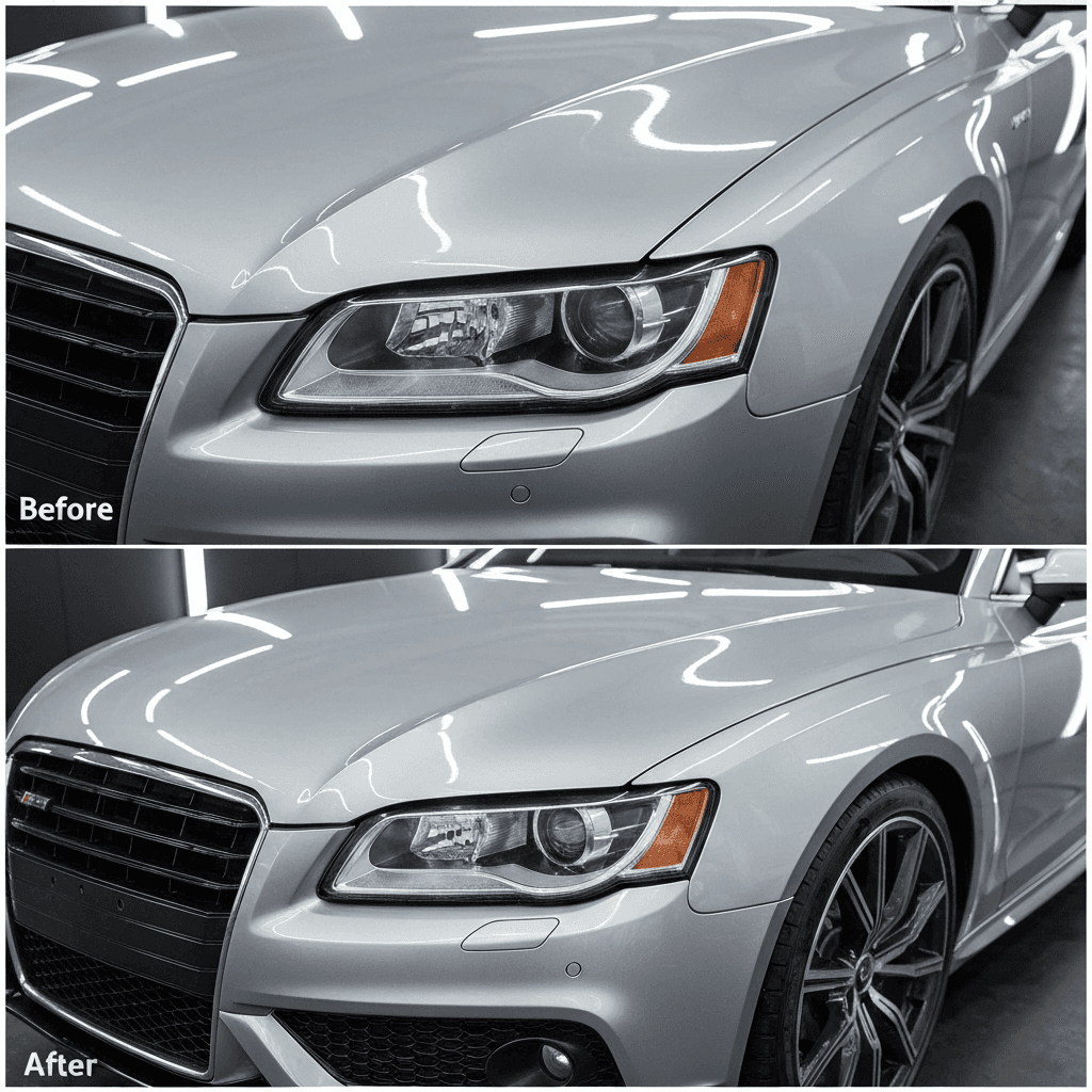 RS5カブリオレはヘッドライトの黄ばみとボディの鉄粉が第一印象を損ねます。研磨+鉄粉除去クリーナー+ワックスで輝きを取り戻せば「程度良好」と判断され+4~7万円の効果。
