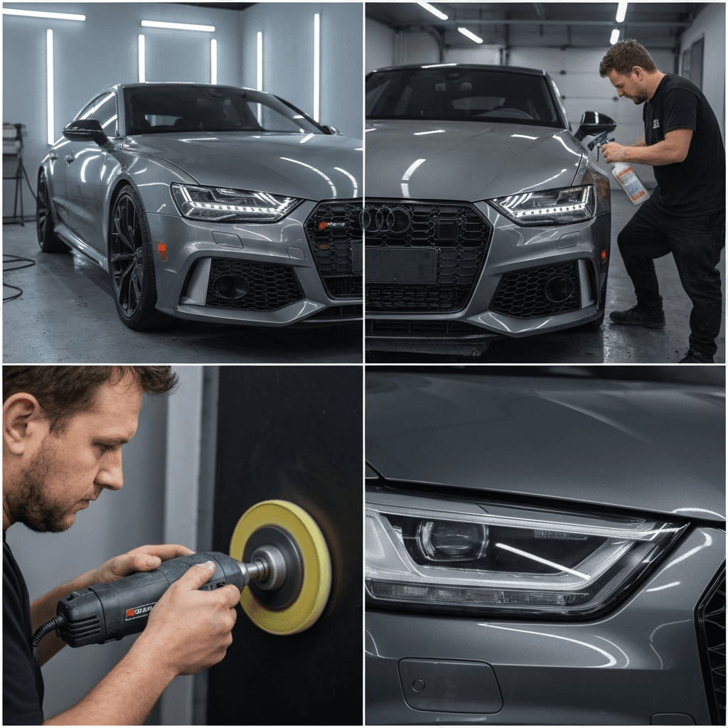 RS7スポーツバックはヘッドライトの黄ばみとボディの鉄粉が第一印象を損ねます。研磨+鉄粉除去クリーナー+ワックスで輝きを取り戻せば「程度良好」と判断され+4~7万円の効果。