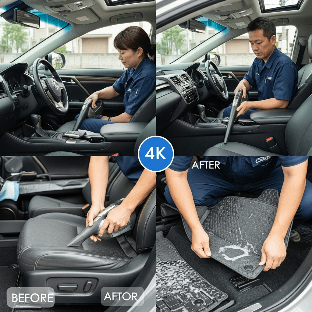 RXは第一印象が査定の8割を決めます。シート隙間のゴミ除去、マット洗浄、樹脂パーツ艶出しで新車級の清潔感に。特に臭いゼロなら「禁煙車」扱いで+5~8万円UP。