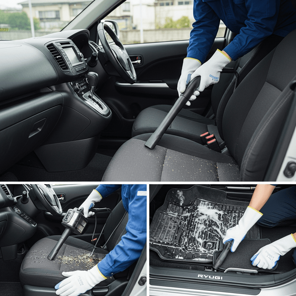 リューギEXは第一印象が査定の8割を決めます。シート隙間のゴミ除去、マット洗浄、樹脂パーツ艶出しで新車級の清潔感に。特に臭いゼロなら「禁煙車」扱いで+5~8万円UP。