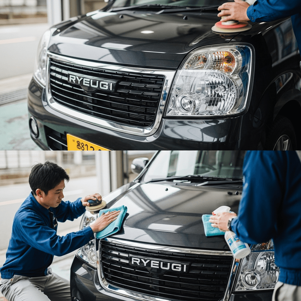 リューギワゴンはヘッドライトの黄ばみとボディの鉄粉が第一印象を損ねます。研磨+鉄粉除去クリーナー+ワックスで輝きを取り戻せば「程度良好」と判断され+4~7万円の効果。