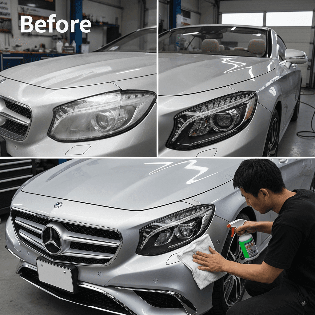 Sクラスカブリオレはヘッドライトの黄ばみとボディの鉄粉が第一印象を損ねます。研磨+鉄粉除去クリーナー+ワックスで輝きを取り戻せば「程度良好」と判断され+4~7万円の効果。