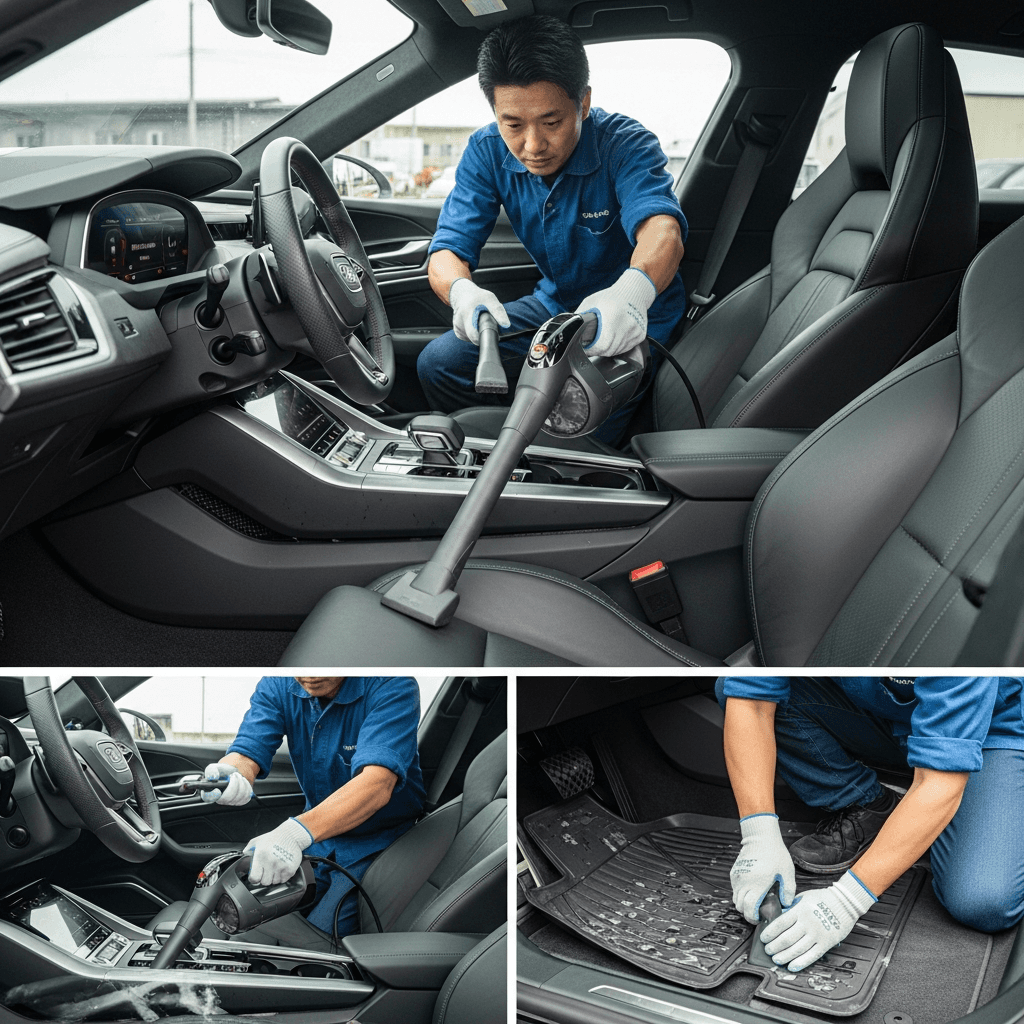 S e-tron GTは第一印象が査定の8割を決めます。シート隙間のゴミ除去、マット洗浄、樹脂パーツ艶出しで新車級の清潔感に。特に臭いゼロなら「禁煙車」扱いで+5~8万円UP。