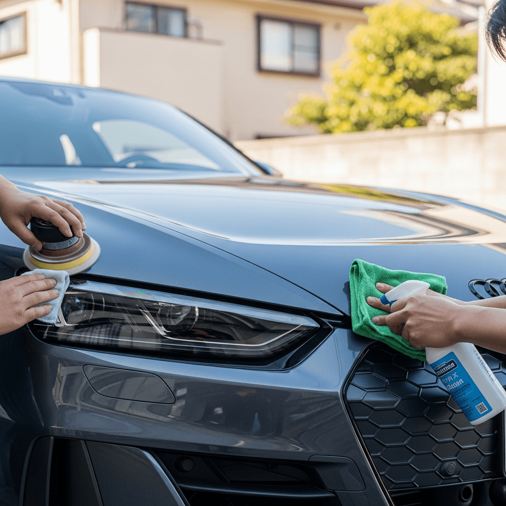 S e-tron GTはヘッドライトの黄ばみとボディの鉄粉が第一印象を損ねます。研磨+鉄粉除去クリーナー+ワックスで輝きを取り戻せば「程度良好」と判断され+4~7万円の効果。