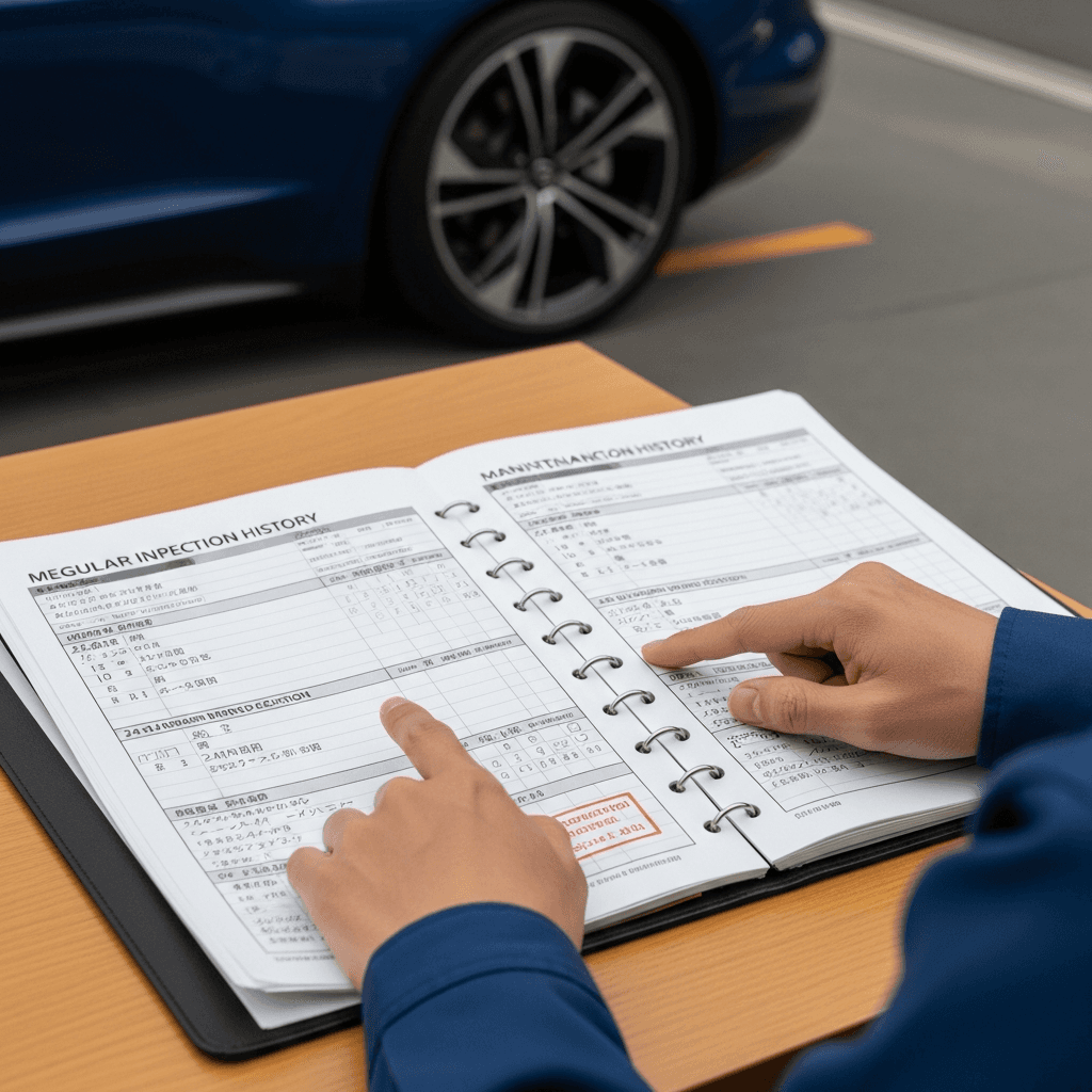 S e-tron GTの整備記録簿に定期点検(12ヶ月・24ヶ月)の履歴が全て記載されていれば「管理の行き届いた車」と高評価。特にエンジンオイル交換履歴は重要で+6~9万円の効果。