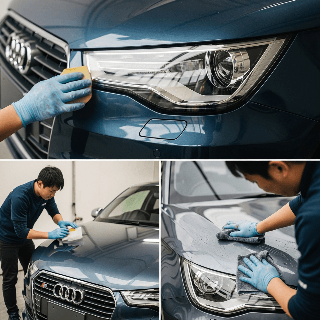 S1スポーツバックはヘッドライトの黄ばみとボディの鉄粉が第一印象を損ねます。研磨+鉄粉除去クリーナー+ワックスで輝きを取り戻せば「程度良好」と判断され+4~7万円の効果。