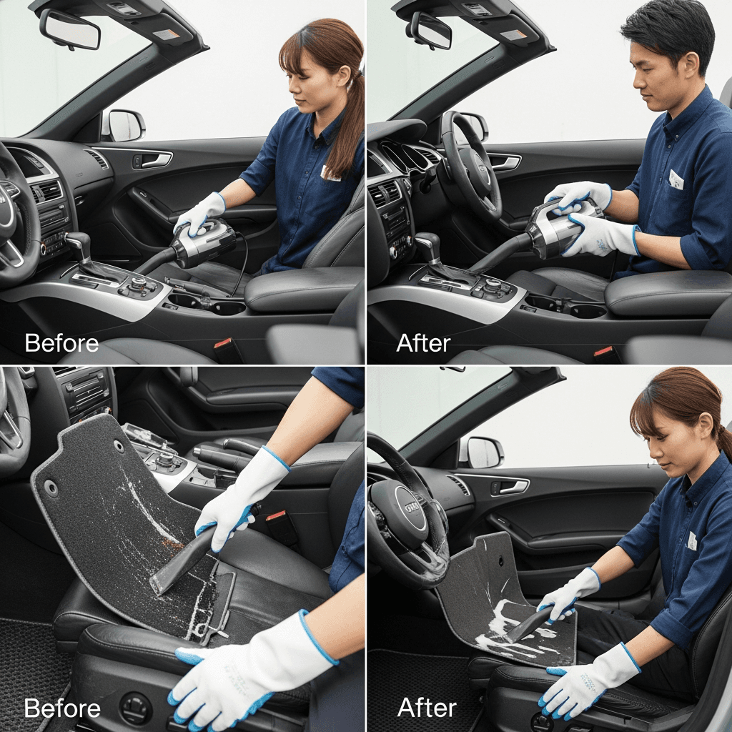 S5カブリオレは第一印象が査定の8割を決めます。シート隙間のゴミ除去、マット洗浄、樹脂パーツ艶出しで新車級の清潔感に。特に臭いゼロなら「禁煙車」扱いで+5~8万円UP。
