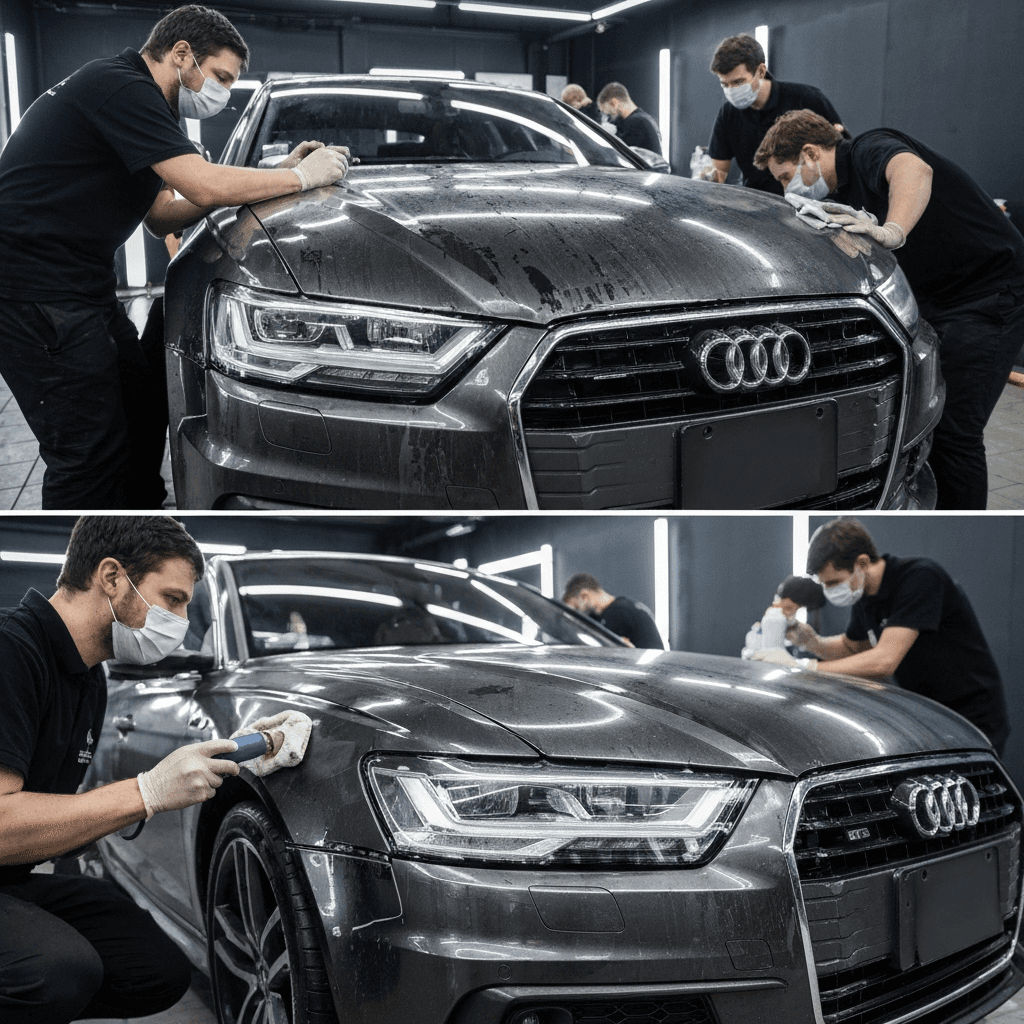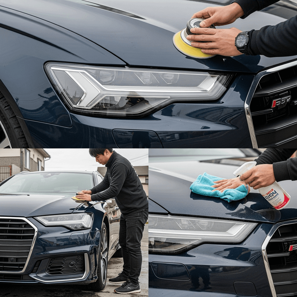 S6スポーツバックe-tronはヘッドライトの黄ばみとボディの鉄粉が第一印象を損ねます。研磨+鉄粉除去クリーナー+ワックスで輝きを取り戻せば「程度良好」と判断され+4~7万円の効果。