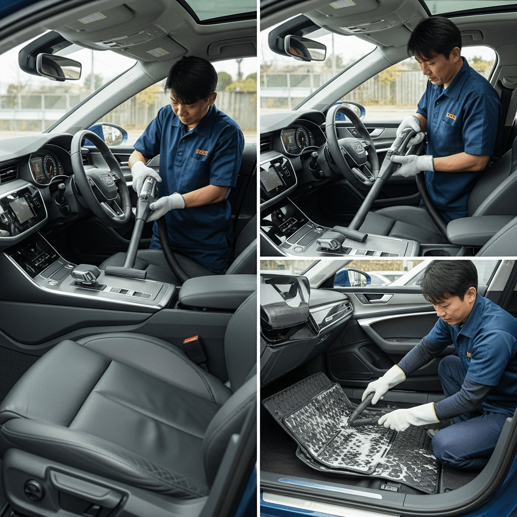 S6スポーツバックe-tronは第一印象が査定の8割を決めます。シート隙間のゴミ除去、マット洗浄、樹脂パーツ艶出しで新車級の清潔感に。特に臭いゼロなら「禁煙車」扱いで+5~8万円UP。