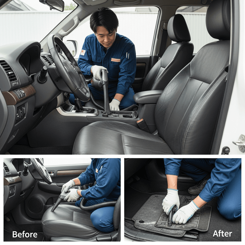 サファリは第一印象が査定の8割を決めます。シート隙間のゴミ除去、マット洗浄、樹脂パーツ艶出しで新車級の清潔感に。特に臭いゼロなら「禁煙車」扱いで+5~8万円UP。