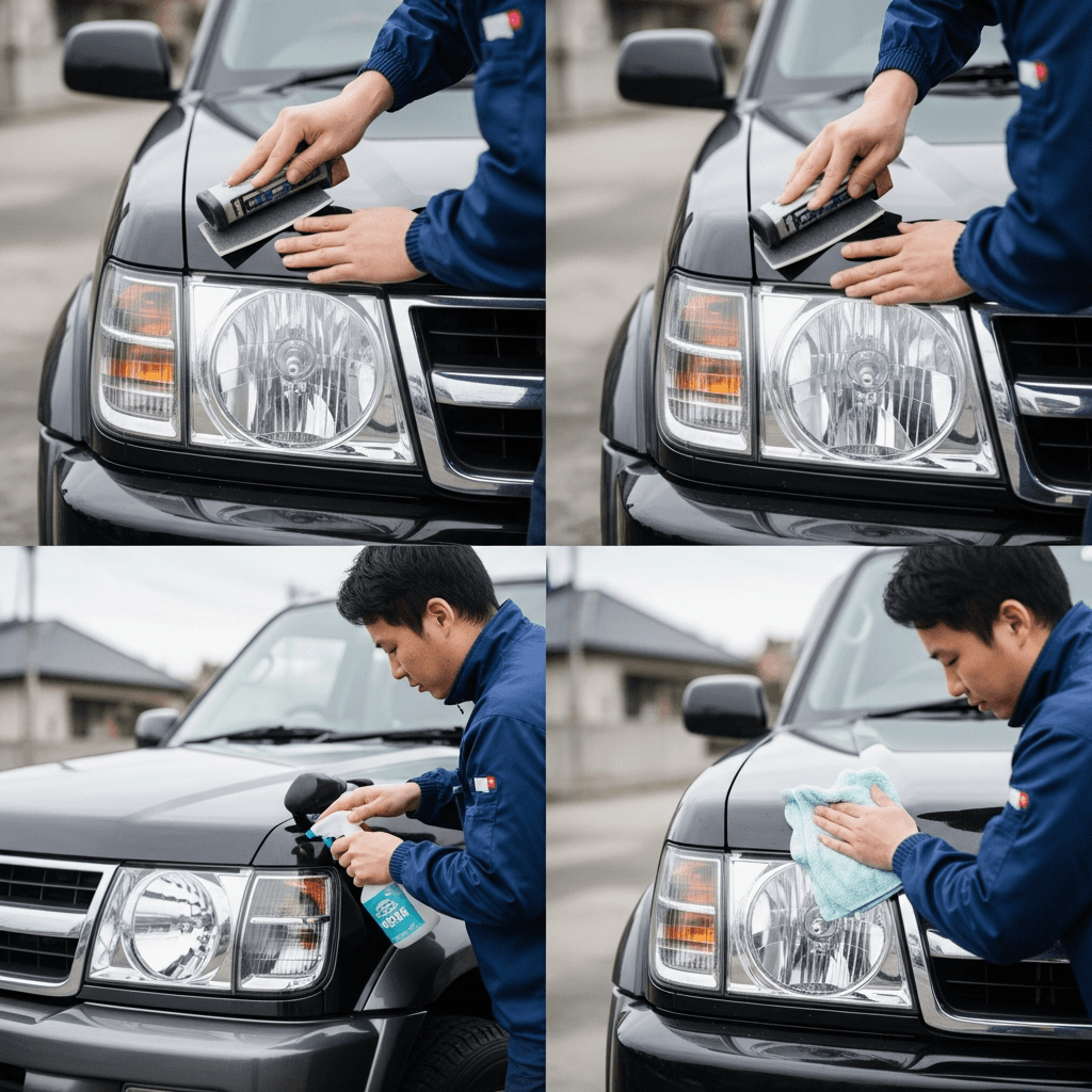 サファリはヘッドライトの黄ばみとボディの鉄粉が第一印象を損ねます。研磨+鉄粉除去クリーナー+ワックスで輝きを取り戻せば「程度良好」と判断され+4~7万円の効果。