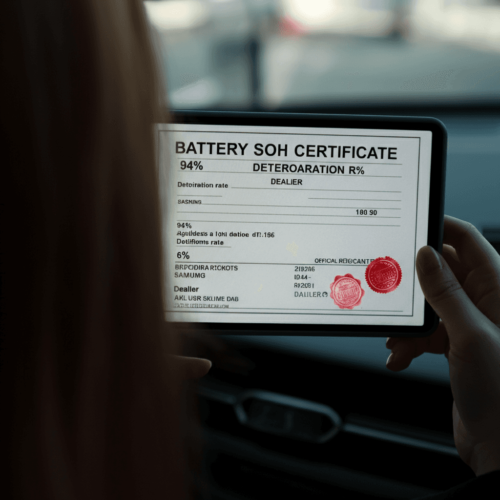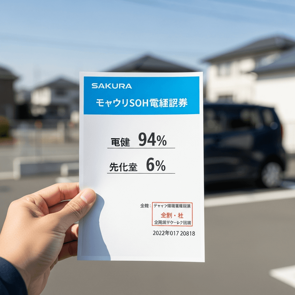 EVの最大不安はバッテリー劣化。ディーラーでSOH(バッテリー健全性)診断を受け、「90%以上」の証明書があれば査定額が劇的にUP。診断費用5,000円で+12~20万円のリターンが期待できます。