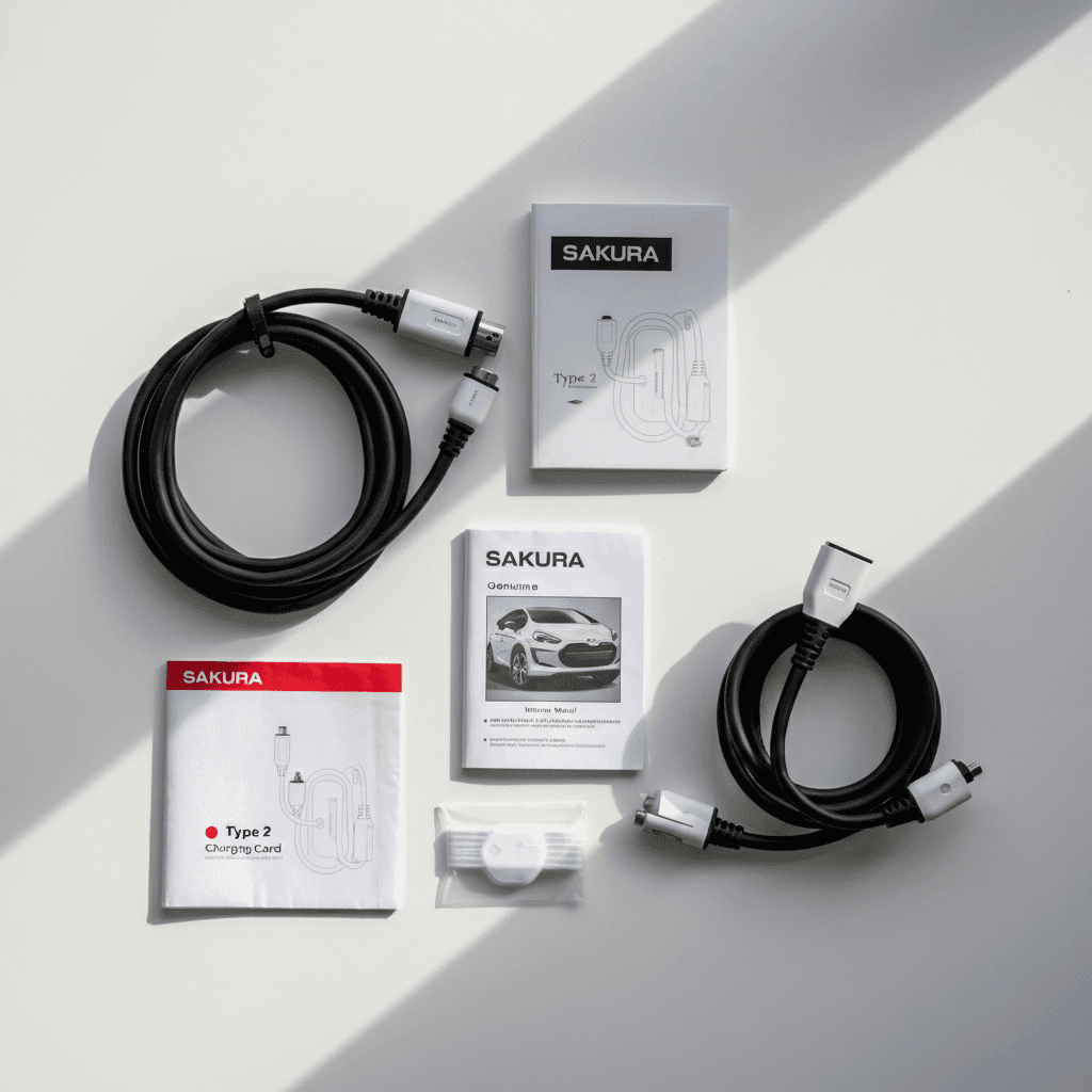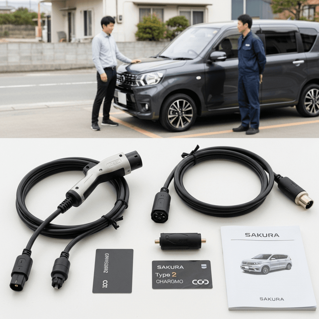 EV車の査定は充電環境が全て。サクラの純正充電ケーブル(普通・急速)、充電カード(会員証)、アダプター類を全て揃えて撮影。「すぐ使える」安心感で+6~10万円UPが期待できます。