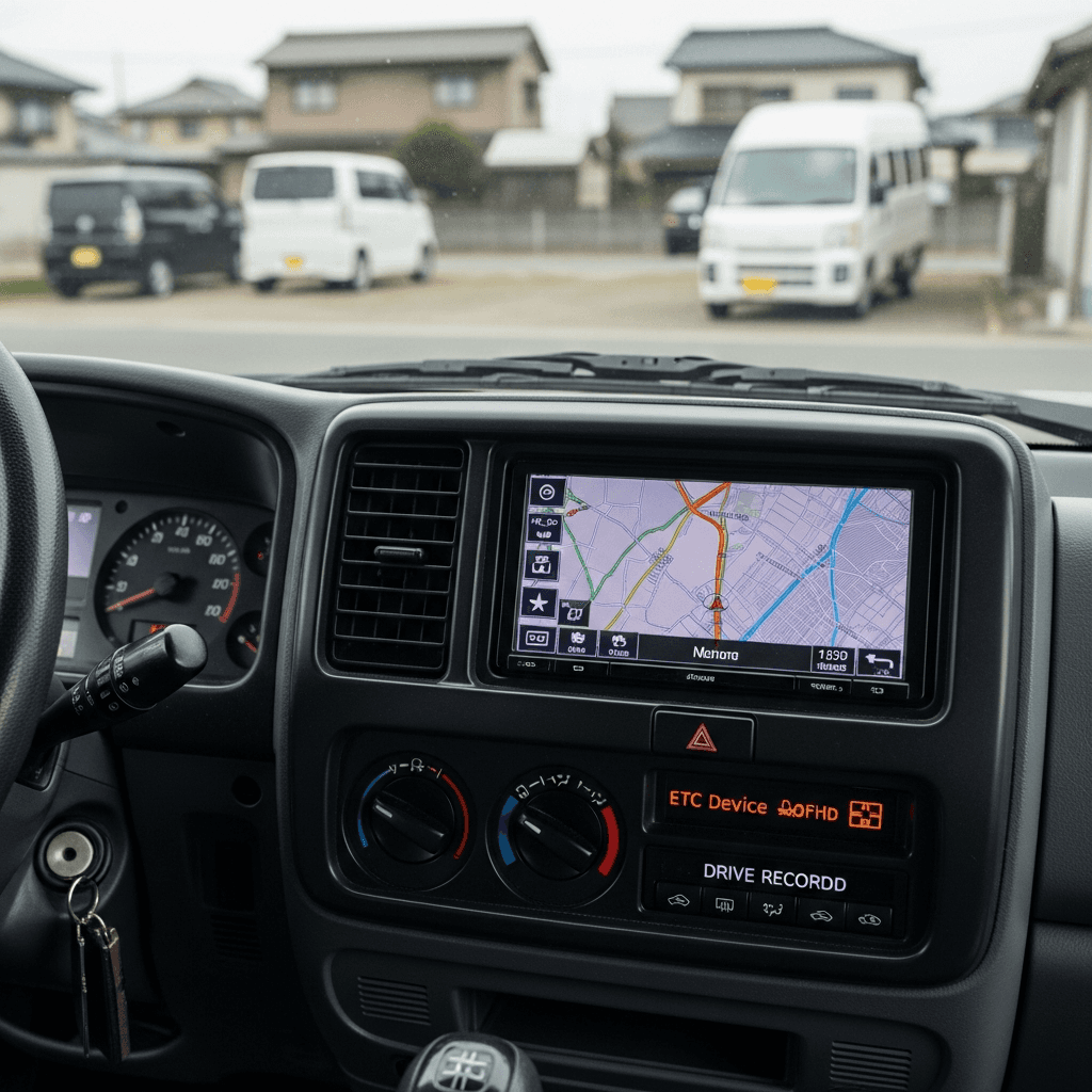 サンバートラックに純正ナビ、ETC、ドライブレコーダーが装着されていれば「すぐ使える装備完璧」で+5~8万円UP。特に軽は装備の有無が査定に直結します。