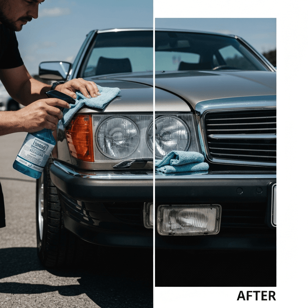 SLクラスはヘッドライトの黄ばみとボディの鉄粉が第一印象を損ねます。研磨+鉄粉除去クリーナー+ワックスで輝きを取り戻せば「程度良好」と判断され+4~7万円の効果。