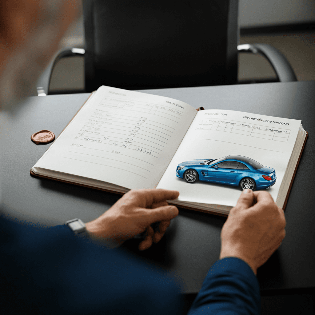 SLクラスの整備記録簿に定期点検(12ヶ月・24ヶ月)の履歴が全て記載されていれば「管理の行き届いた車」と高評価。特にエンジンオイル交換履歴は重要で+6~9万円の効果。