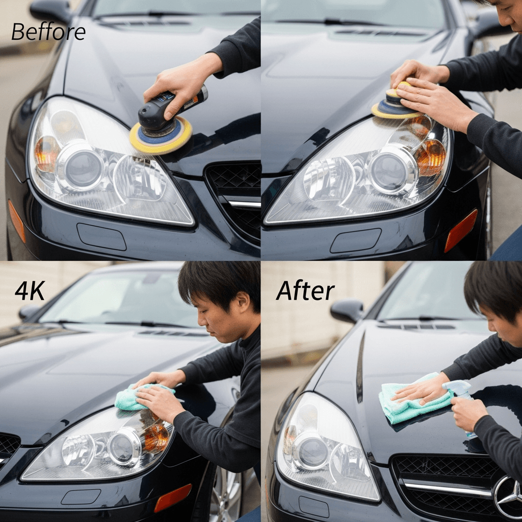 SLKクラスはヘッドライトの黄ばみとボディの鉄粉が第一印象を損ねます。研磨+鉄粉除去クリーナー+ワックスで輝きを取り戻せば「程度良好」と判断され+4~7万円の効果。