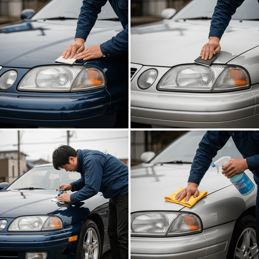 ソアラエアロキャビンはヘッドライトの黄ばみとボディの鉄粉が第一印象を損ねます。研磨+鉄粉除去クリーナー+ワックスで輝きを取り戻せば「程度良好」と判断され+4~7万円の効果。