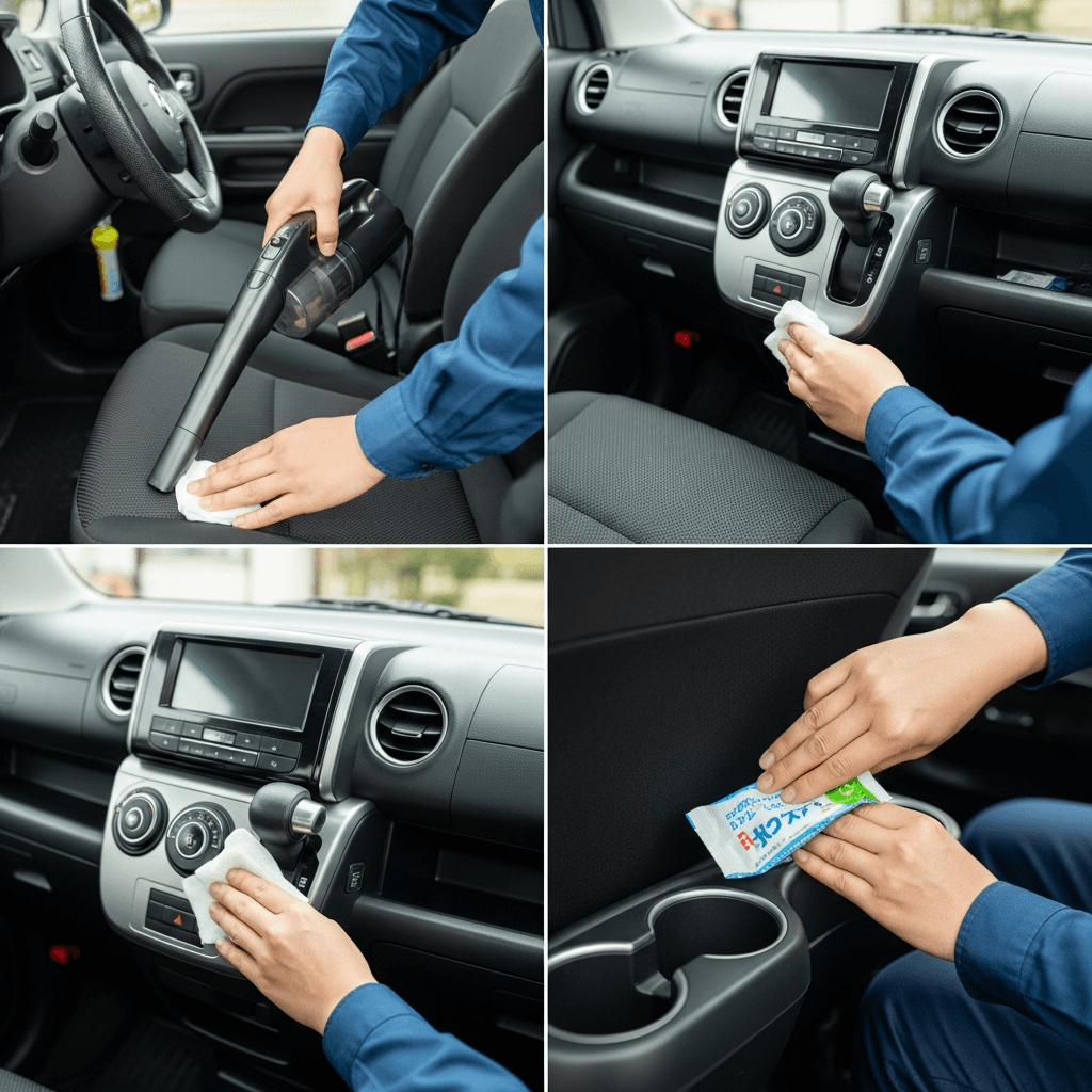 軽自動車は女性・高齢者の次オーナーが多く、清潔感が最重視されます。シート・フロアマット・ダッシュボードを徹底清掃し、消臭剤で無臭化すれば+4~7万円の効果。