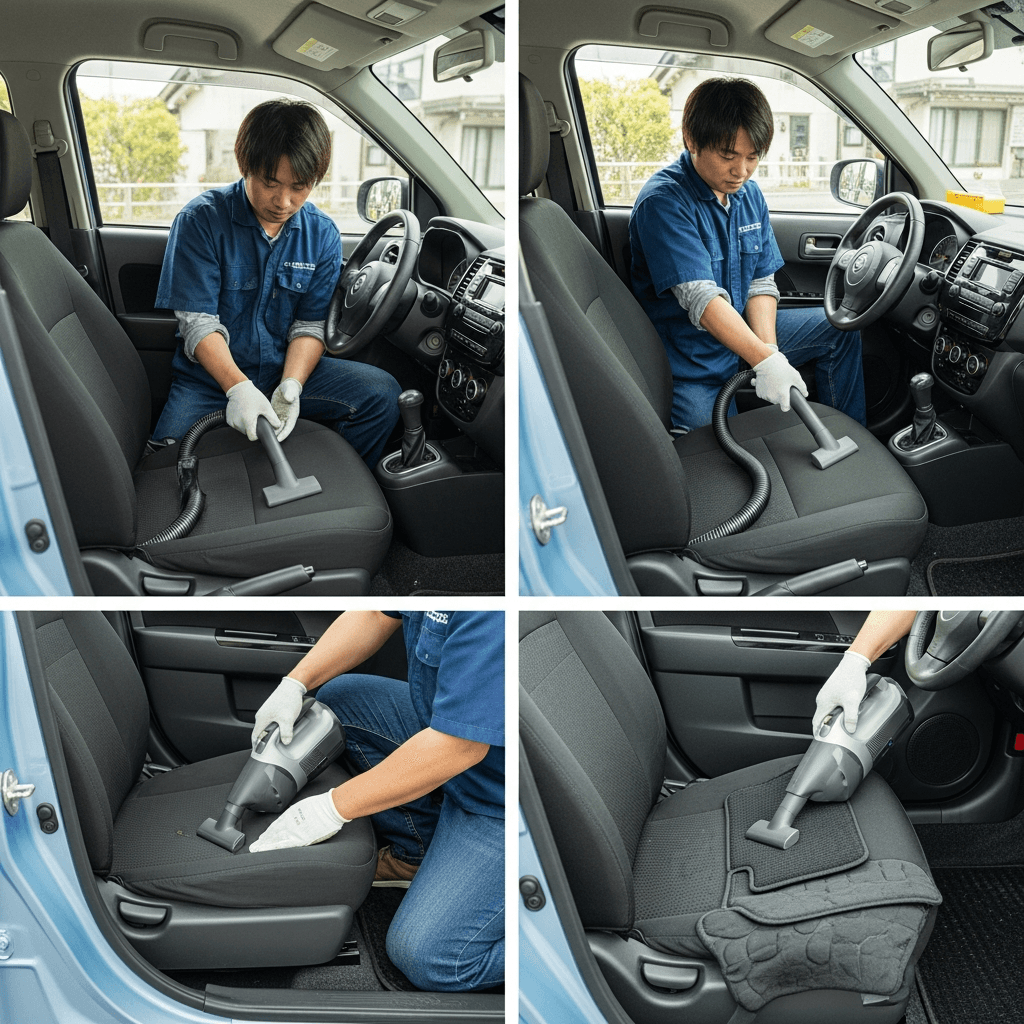スパーキーは第一印象が査定の8割を決めます。シート隙間のゴミ除去、マット洗浄、樹脂パーツ艶出しで新車級の清潔感に。特に臭いゼロなら「禁煙車」扱いで+5~8万円UP。