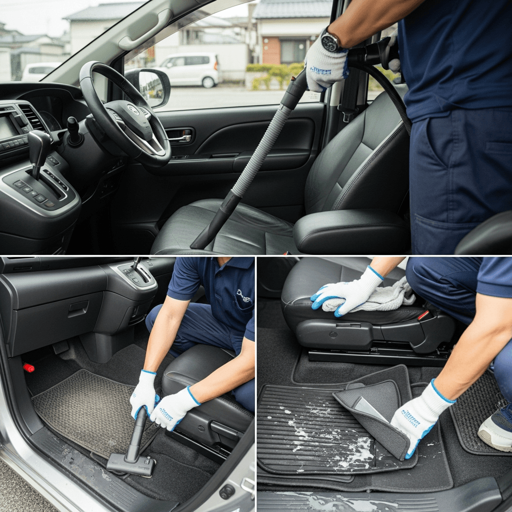 スピアーノは第一印象が査定の8割を決めます。シート隙間のゴミ除去、マット洗浄、樹脂パーツ艶出しで新車級の清潔感に。特に臭いゼロなら「禁煙車」扱いで+5~8万円UP。