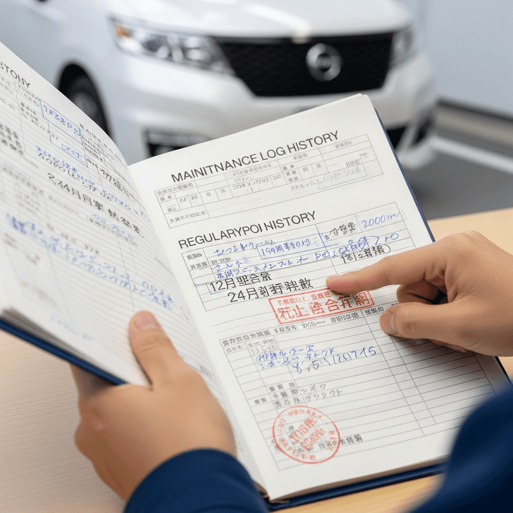 スピアーノの整備記録簿に定期点検(12ヶ月・24ヶ月)の履歴が全て記載されていれば「管理の行き届いた車」と高評価。特にエンジンオイル交換履歴は重要で+6~9万円の効果。