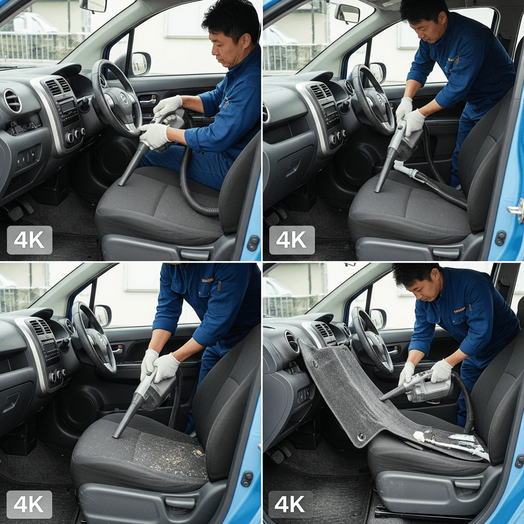 スプラッシュは第一印象が査定の8割を決めます。シート隙間のゴミ除去、マット洗浄、樹脂パーツ艶出しで新車級の清潔感に。特に臭いゼロなら「禁煙車」扱いで+5~8万円UP。