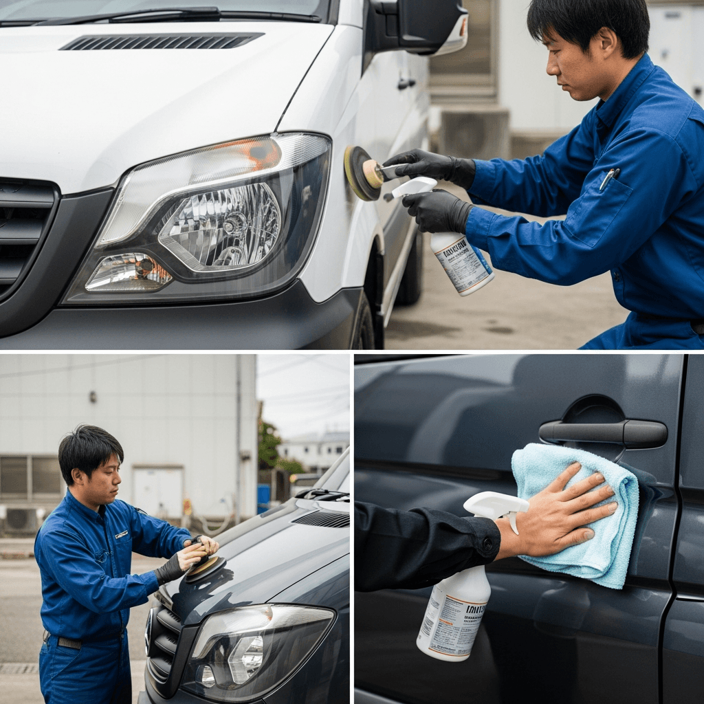 スプリンターバンはヘッドライトの黄ばみとボディの鉄粉が第一印象を損ねます。研磨+鉄粉除去クリーナー+ワックスで輝きを取り戻せば「程度良好」と判断され+4~7万円の効果。