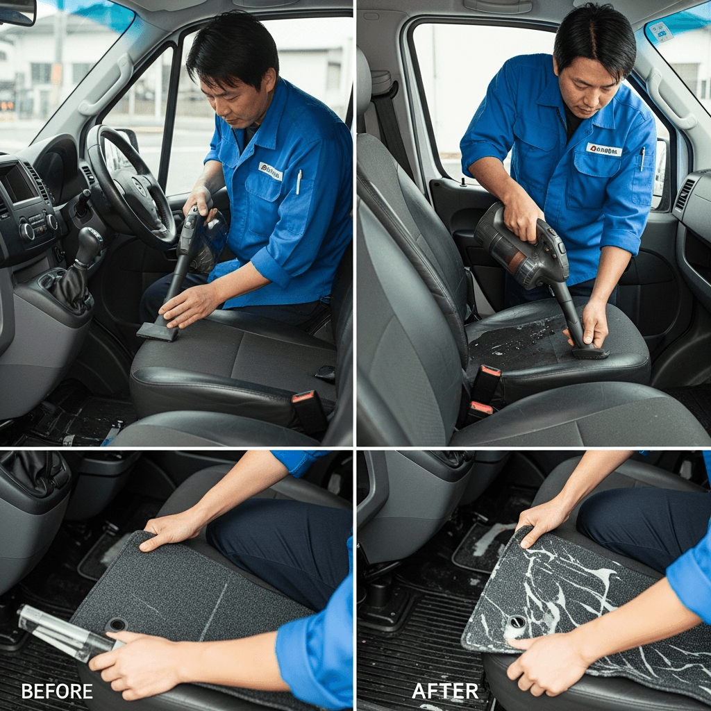 スプリンターバンは第一印象が査定の8割を決めます。シート隙間のゴミ除去、マット洗浄、樹脂パーツ艶出しで新車級の清潔感に。特に臭いゼロなら「禁煙車」扱いで+5~8万円UP。