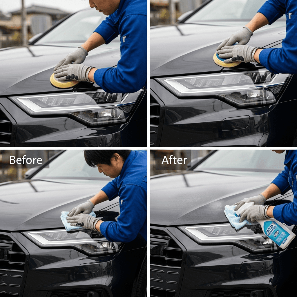 SQ6スポーツバックe-tronはヘッドライトの黄ばみとボディの鉄粉が第一印象を損ねます。研磨+鉄粉除去クリーナー+ワックスで輝きを取り戻せば「程度良好」と判断され+4~7万円の効果。