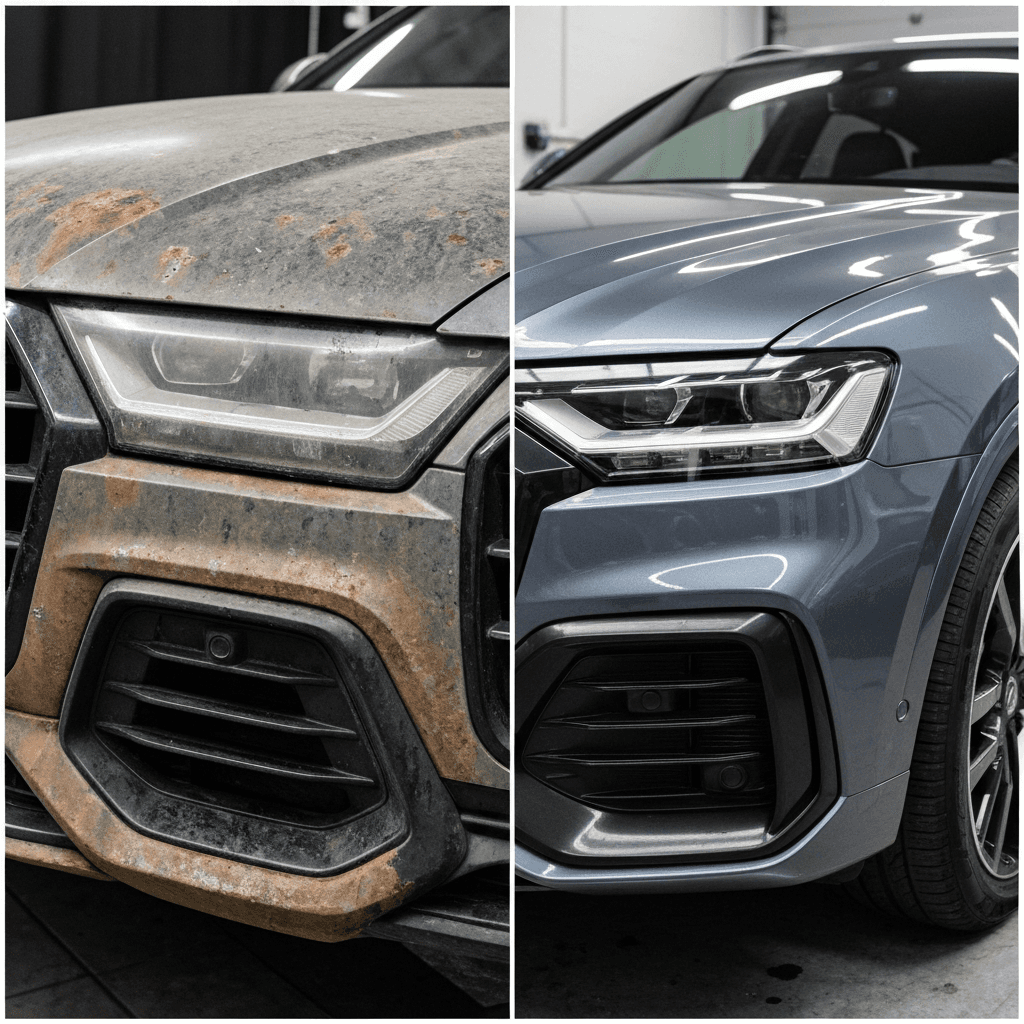 SQ8はヘッドライトの黄ばみとボディの鉄粉が第一印象を損ねます。研磨+鉄粉除去クリーナー+ワックスで輝きを取り戻せば「程度良好」と判断され+4~7万円の効果。