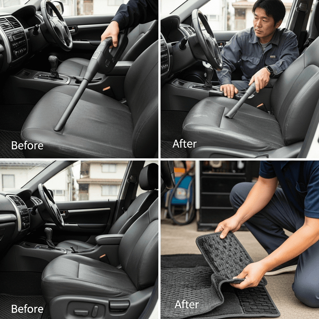スタリオンは第一印象が査定の8割を決めます。シート隙間のゴミ除去、マット洗浄、樹脂パーツ艶出しで新車級の清潔感に。特に臭いゼロなら「禁煙車」扱いで+5~8万円UP。