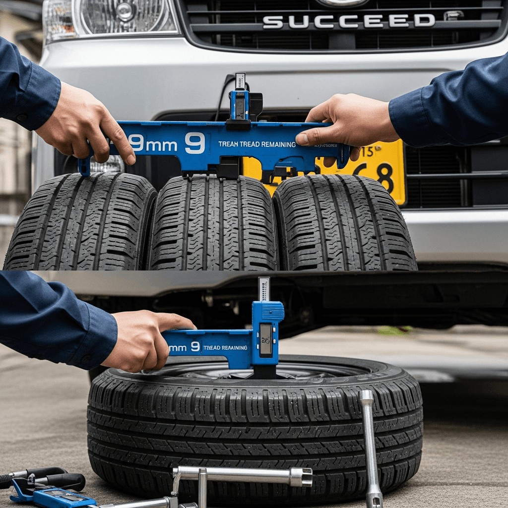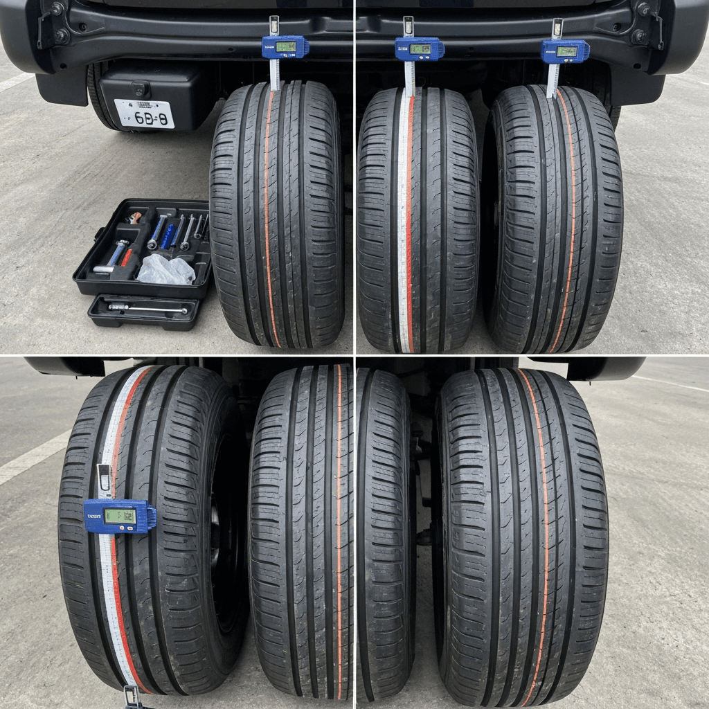 商用車はタイヤが消耗品。4本新品(または溝8mm以上)+スペアタイヤ完備なら「すぐ業務使用可能」で+4~7万円UP。特にサクシードバンは配送業需要が高く効果大。