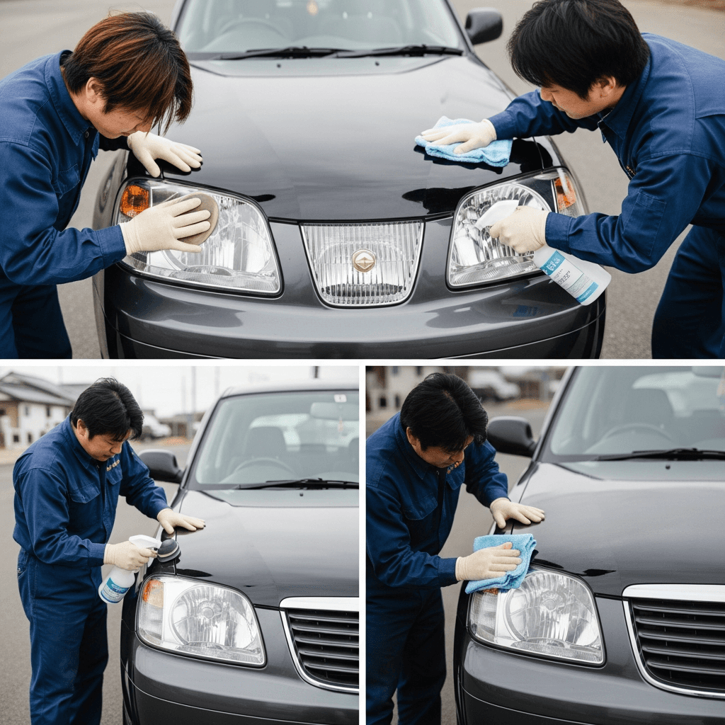 サニーカリフォルニアはヘッドライトの黄ばみとボディの鉄粉が第一印象を損ねます。研磨+鉄粉除去クリーナー+ワックスで輝きを取り戻せば「程度良好」と判断され+4~7万円の効果。
