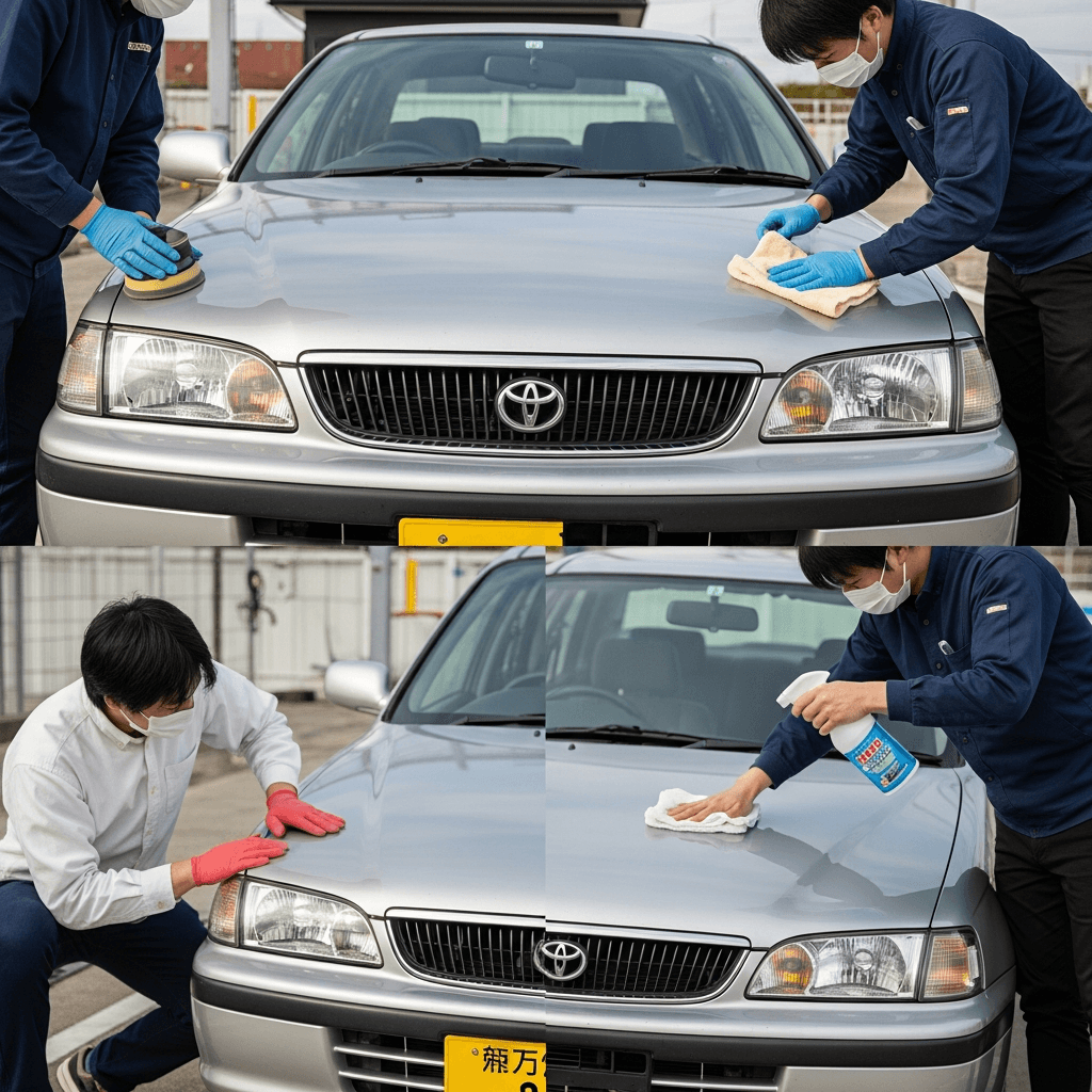 サニーRZ-1はヘッドライトの黄ばみとボディの鉄粉が第一印象を損ねます。研磨+鉄粉除去クリーナー+ワックスで輝きを取り戻せば「程度良好」と判断され+4~7万円の効果。