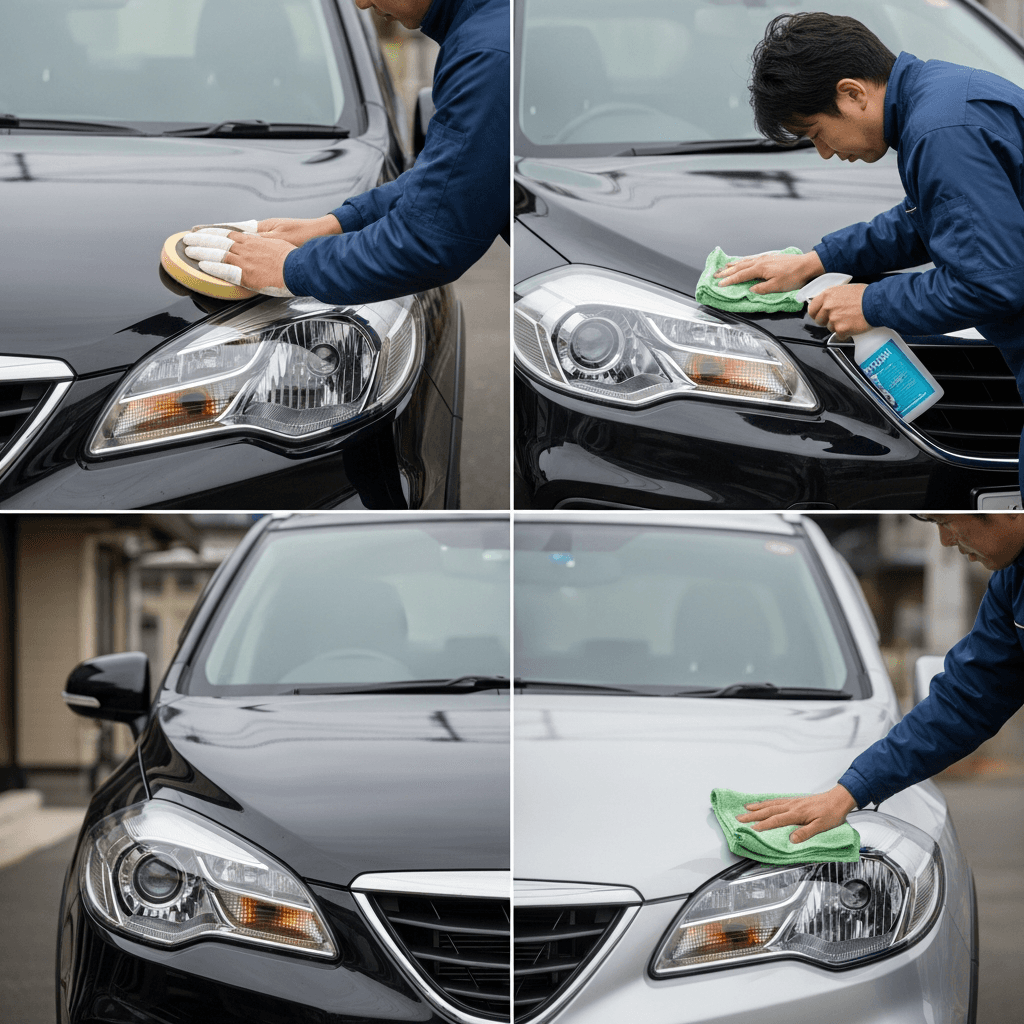 SX4 S-CROSSはヘッドライトの黄ばみとボディの鉄粉が第一印象を損ねます。研磨+鉄粉除去クリーナー+ワックスで輝きを取り戻せば「程度良好」と判断され+4~7万円の効果。