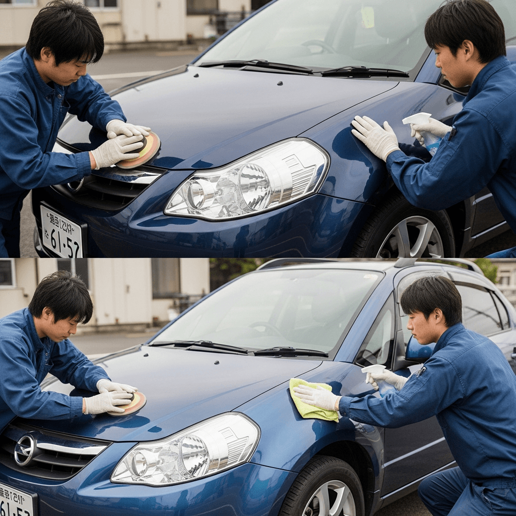 SX4セダンはヘッドライトの黄ばみとボディの鉄粉が第一印象を損ねます。研磨+鉄粉除去クリーナー+ワックスで輝きを取り戻せば「程度良好」と判断され+4~7万円の効果。