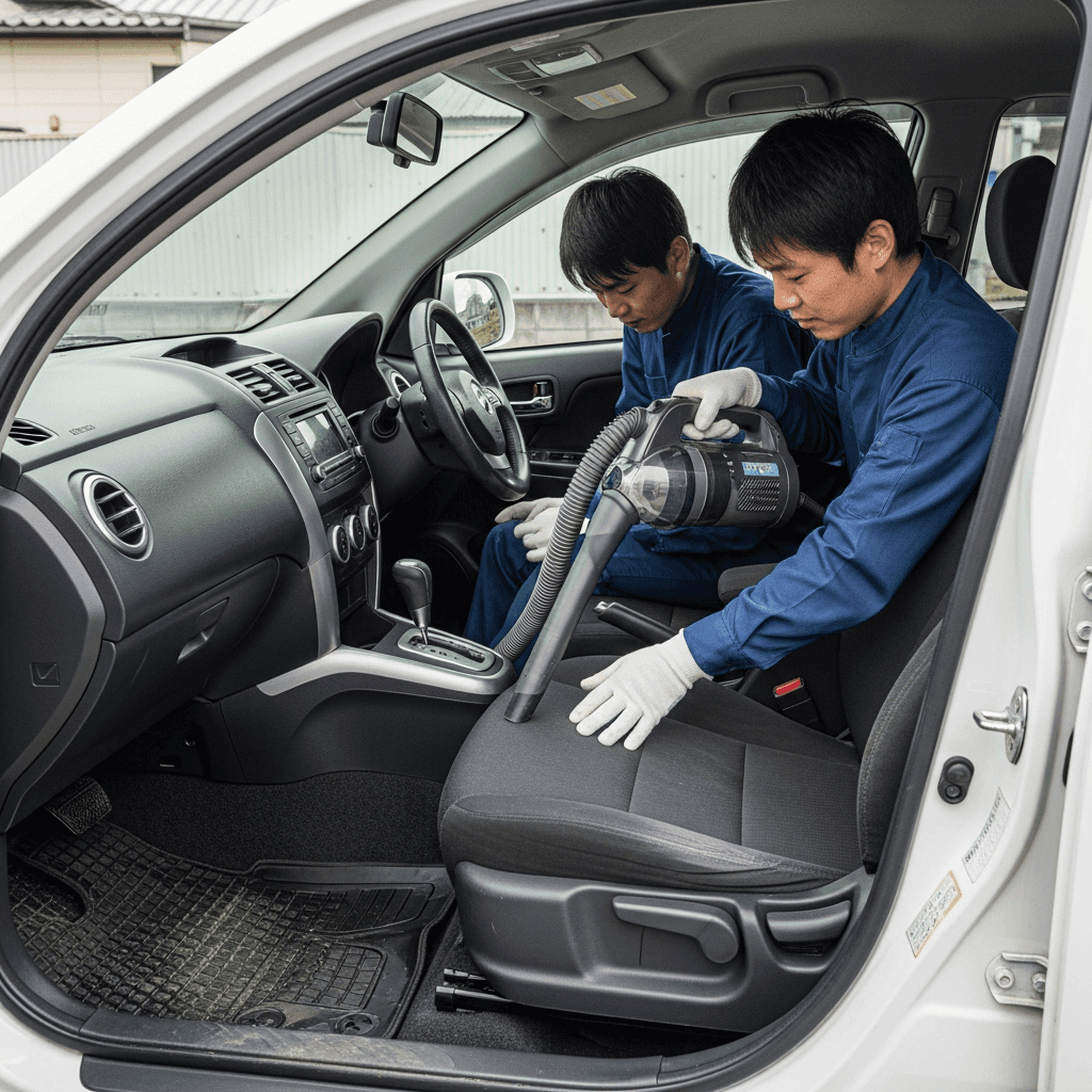 SX4セダンは第一印象が査定の8割を決めます。シート隙間のゴミ除去、マット洗浄、樹脂パーツ艶出しで新車級の清潔感に。特に臭いゼロなら「禁煙車」扱いで+5~8万円UP。