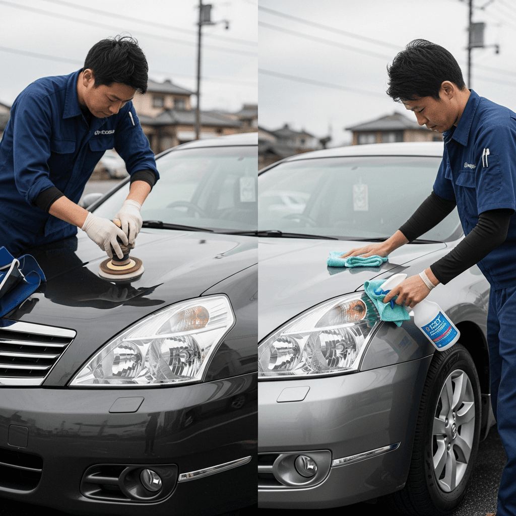 ティアナはヘッドライトの黄ばみとボディの鉄粉が第一印象を損ねます。研磨+鉄粉除去クリーナー+ワックスで輝きを取り戻せば「程度良好」と判断され+4~7万円の効果。