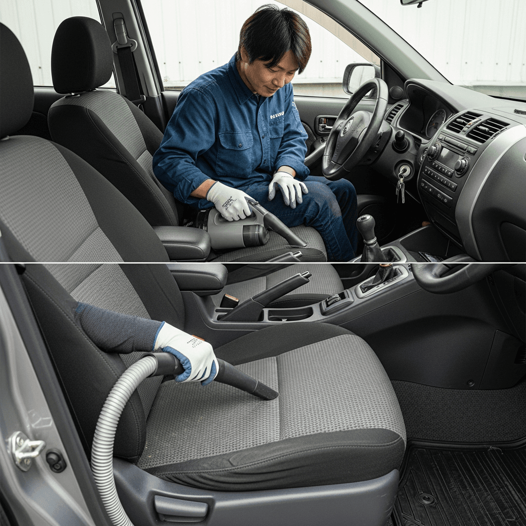テリオスルキアは第一印象が査定の8割を決めます。シート隙間のゴミ除去、マット洗浄、樹脂パーツ艶出しで新車級の清潔感に。特に臭いゼロなら「禁煙車」扱いで+5~8万円UP。
