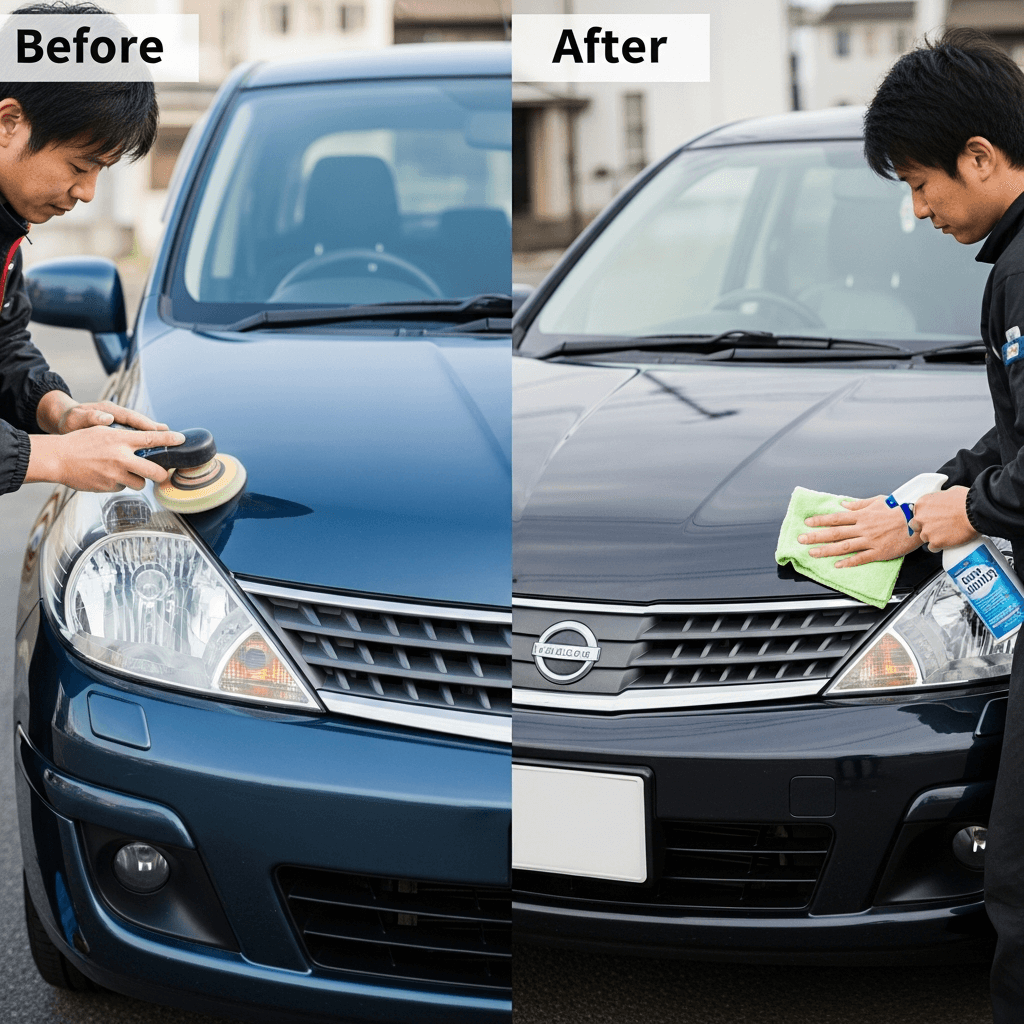 ティーダはヘッドライトの黄ばみとボディの鉄粉が第一印象を損ねます。研磨+鉄粉除去クリーナー+ワックスで輝きを取り戻せば「程度良好」と判断され+4~7万円の効果。