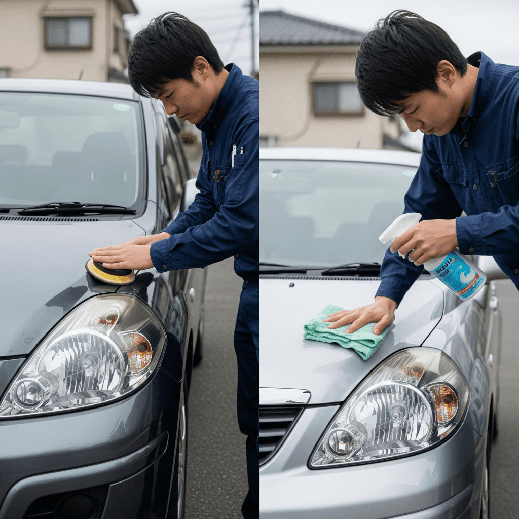ティーダラティオはヘッドライトの黄ばみとボディの鉄粉が第一印象を損ねます。研磨+鉄粉除去クリーナー+ワックスで輝きを取り戻せば「程度良好」と判断され+4~7万円の効果。