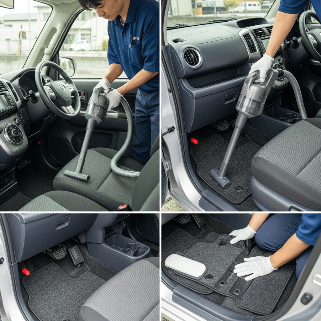 ティーノは第一印象が査定の8割を決めます。シート隙間のゴミ除去、マット洗浄、樹脂パーツ艶出しで新車級の清潔感に。特に臭いゼロなら「禁煙車」扱いで+5~8万円UP。