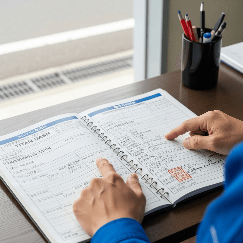 タイタンダッシュの整備記録簿に定期点検(12ヶ月・24ヶ月)の履歴が全て記載されていれば「管理の行き届いた車」と高評価。特にエンジンオイル交換履歴は重要で+6~9万円の効果。
