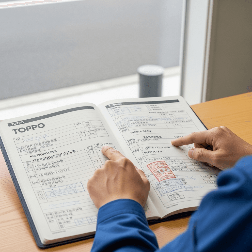 トッポの整備記録簿に定期点検(12ヶ月・24ヶ月)の履歴が全て記載されていれば「管理の行き届いた車」と高評価。特にエンジンオイル交換履歴は重要で+6~9万円の効果。