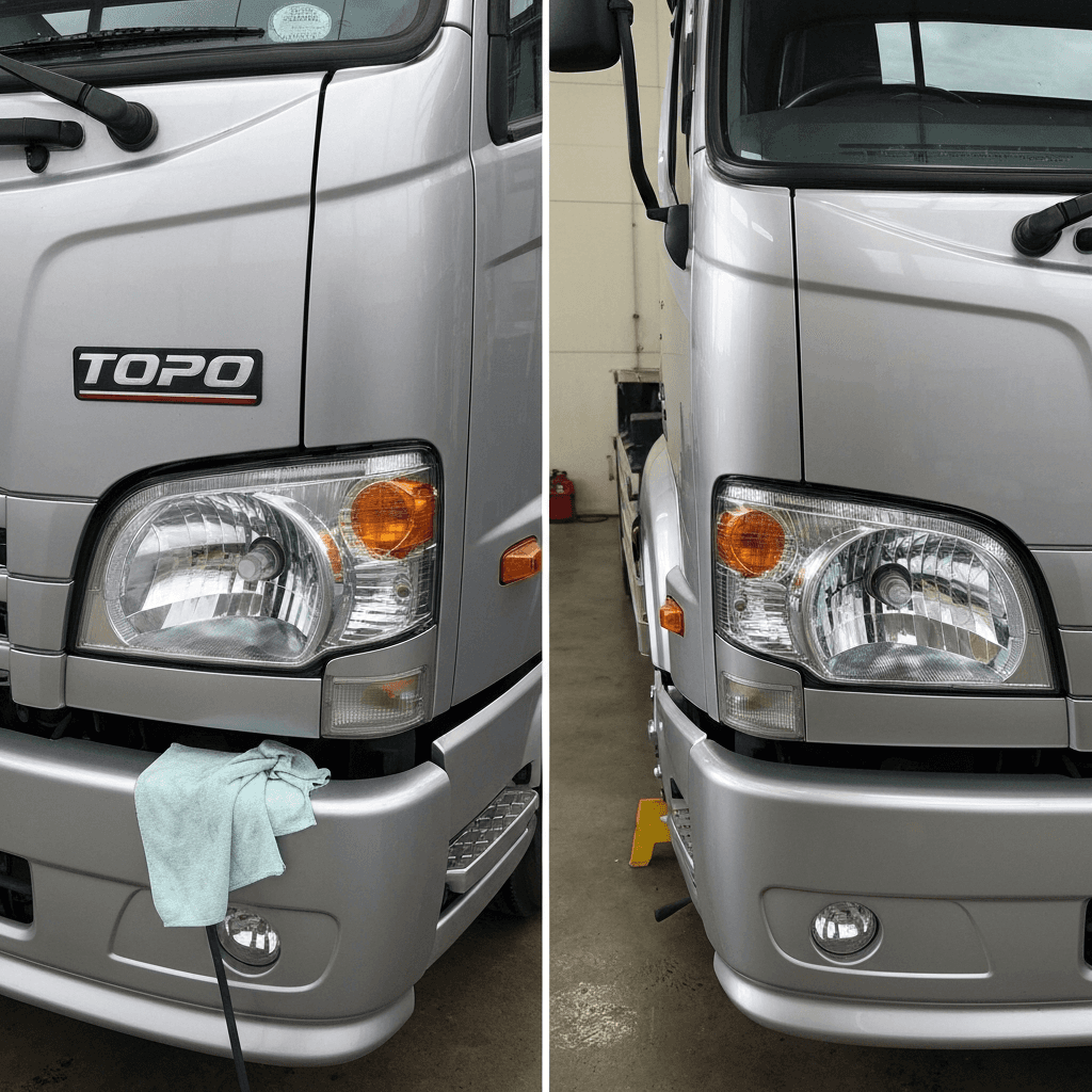 トッポBJワイドはヘッドライトの黄ばみとボディの鉄粉が第一印象を損ねます。研磨+鉄粉除去クリーナー+ワックスで輝きを取り戻せば「程度良好」と判断され+4~7万円の効果。