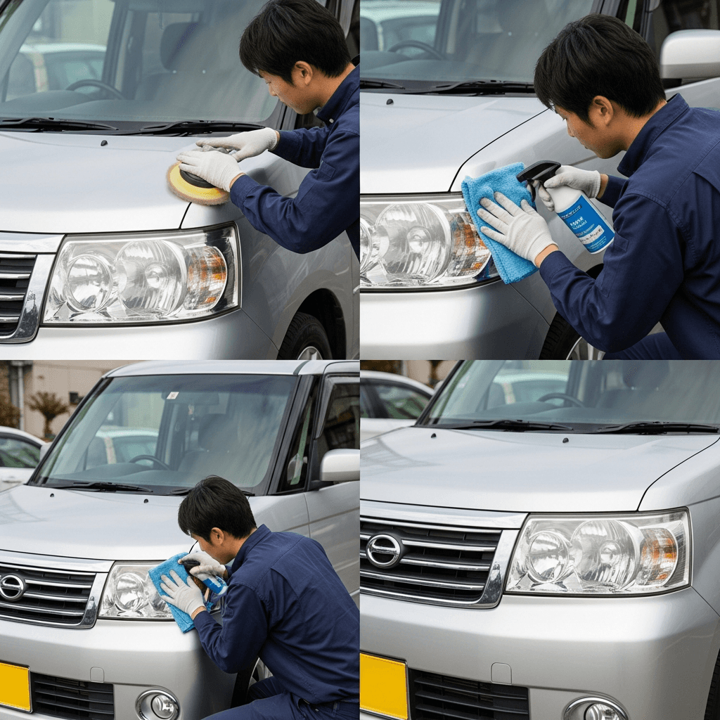 タウンボックスはヘッドライトの黄ばみとボディの鉄粉が第一印象を損ねます。研磨+鉄粉除去クリーナー+ワックスで輝きを取り戻せば「程度良好」と判断され+4~7万円の効果。